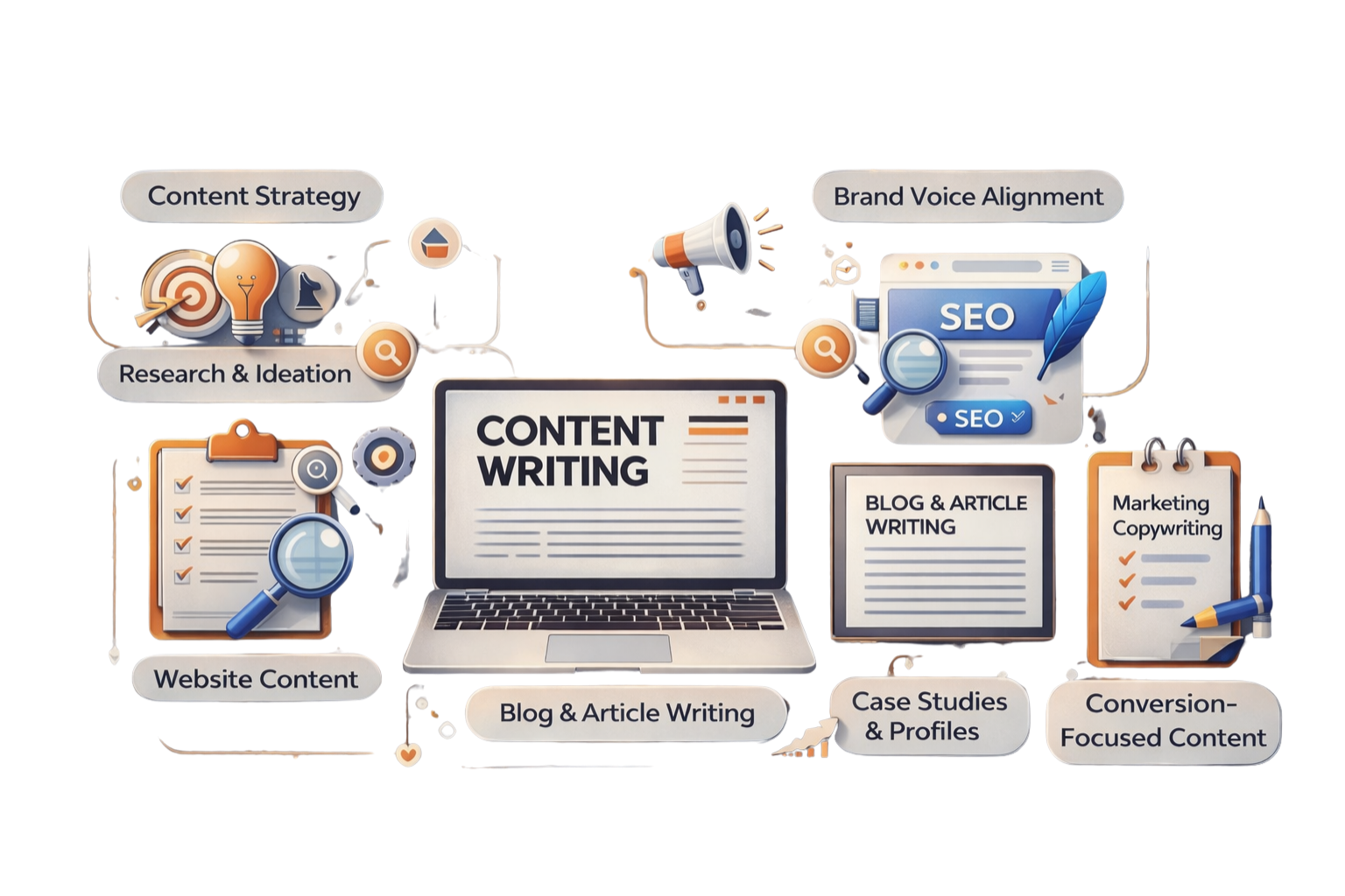 Our Content Writing Services are designed to help brands communicate clearly, connect emotionally, and convert effectively. We create high-quality, engaging, and purpose-driven content that reflects your brand voice while addressing your audience’s needs. From website content and blogs to company profiles, case studies, and marketing copy, every piece is crafted with a strong focus on clarity, relevance, and impact. By combining strategic storytelling with SEO best practices, we ensure your content not only looks professional but also drives visibility, trust, and measurable business growth across digital platforms.